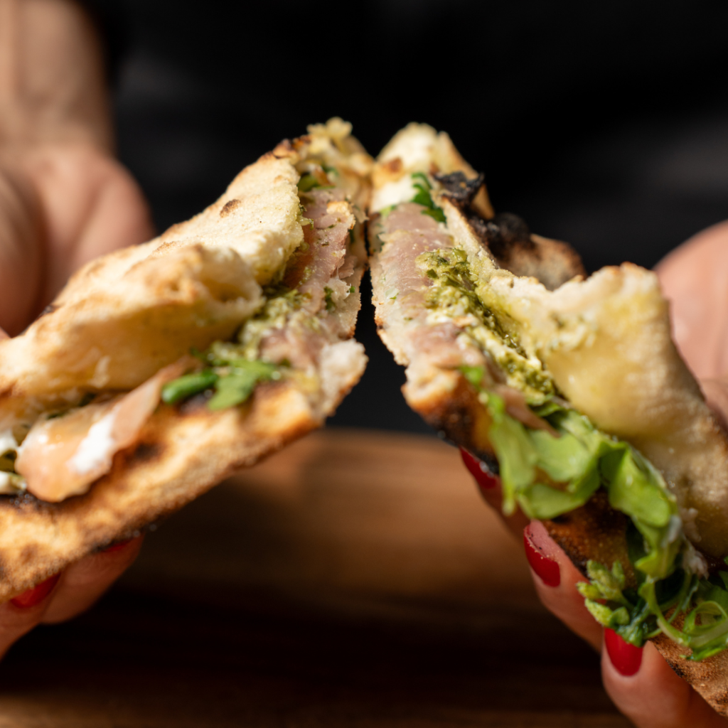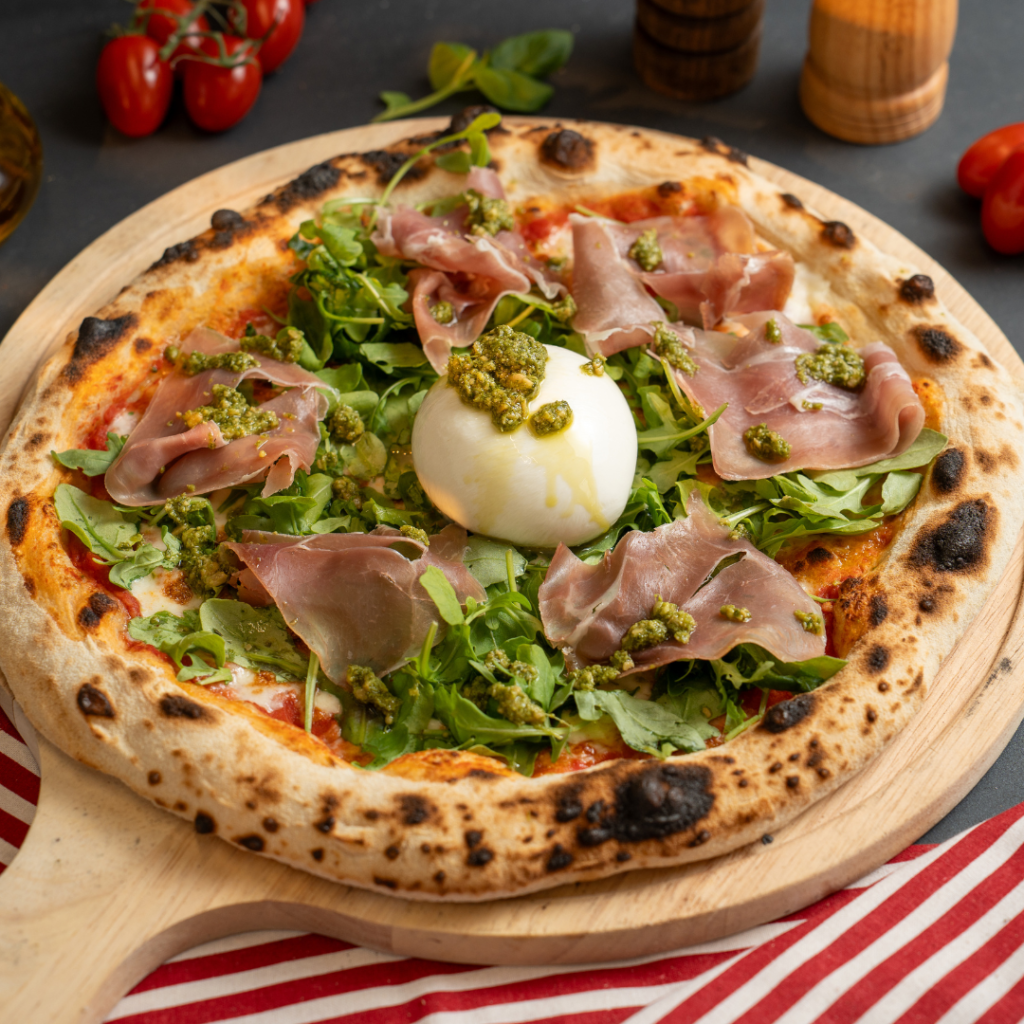 A rich Italian San Marzano tomato sauce, Mozzarella Fior di Latte, Rocket, Prosciutto, burrata, rocket & basil pesto a chef’s masterpiece in every bite