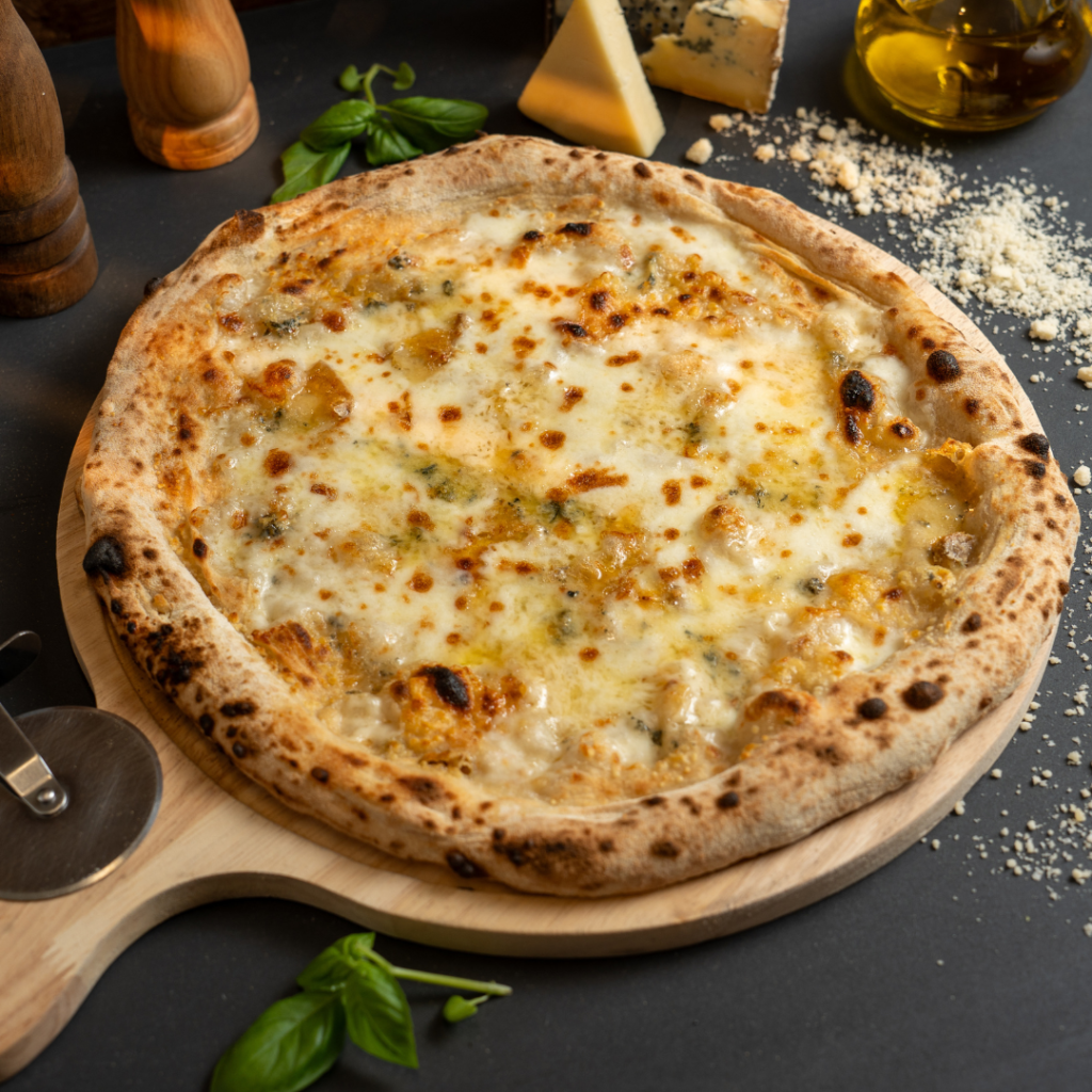 Rich San Marzano tomato sauce & 4 delicious cheese selection directly from Italy (Gorgonzola, Parmigiano, Mozzarella Fior Di Latte and Provolone). Suitable for Vegetarians